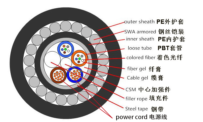 GDYTA33光电混合缆的结构是将单模或多模光纤套入由高模量的聚酯材料做成的松套管中,套管内填充防水化合物。 缆的中心是一根金属加强芯,松套管和填充绳围绕中心加强芯绞合成紧凑的圆形缆芯,缆芯内的缝隙充以阻水填充物,内置电源线然后用双面镀铬涂塑钢带(PSP)纵包后覆以聚乙烯内护套,内护套外一圈钢丝铠装,最后用聚乙烯外护套成缆。