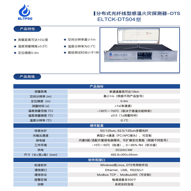 关键词:分布式光纤线型感温火灾探测器、DTS消防测温主机、感温光缆分布式测温主机、ELTCK-DTS04感温测控主机、油管测控主机、地铁隧道温度测控主机