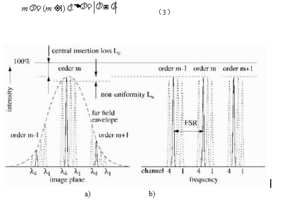 从(2)式可以看到,同一波长的不同衍射级次,将衍射为不同角度,聚焦到不同的输出波导中,如图5(a)所示,其中主衍射级次的光功率最强,次级衍射光功率迅速衰减。在满足(3)式的情况下,不同波长的主衍射级次将进入相同的输出波导,造成串扰,Δλ称为AWG的自由光谱范围(FSR),如图5(b)所示,为避免串扰,FSR应大于需要复用/解复用的信号谱宽。
