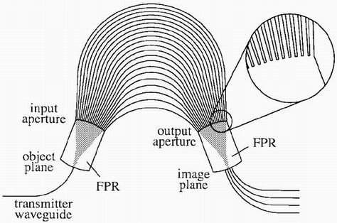 输入星形耦合器与输出星形耦合器成镜像关系,输入波导发出的光信号经阵列波导衍射,不同波长聚焦到不同输出波导;图4中罗兰圆上C点发出的光信号经凹面光栅反射衍射,不同波长聚焦到罗兰圆上的不同点。二者完全等效,差别只在于后者是反射式光栅,而前者是透射式光栅。对于前者,我们也可以理解为图3(b)中波导C发出的光信号,经阵列波导反射衍射并聚焦到不同输出波导中。