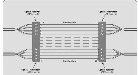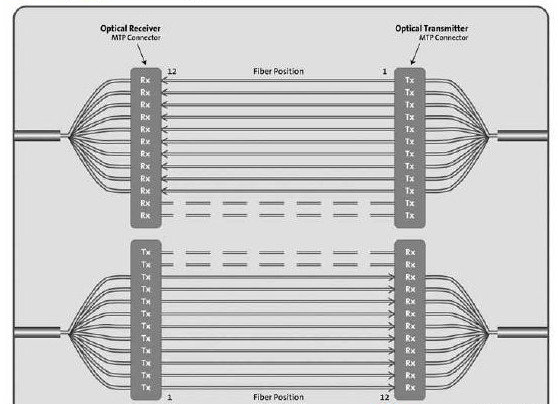 并行光学技术(包括850nm VCSEL矩阵和OM3光纤)为以太网和光纤通道(Fiber Channel)提供了低成本、高速率的解决方案。并行光传输技术采用空分多路复用,即将高速信号分配给几根光纤同时发送和接受;在接受端,信号经过解复用还原成高速信号。在整个并行光信道中,需要采用多芯连接器MTP连接。