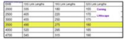 新的光纤必需首先考虑数据中心用户的实际需求。经过对数据中心光纤布线长度的统计,>87%的链路长度小于150m,> 95%的链路长度小于200m, 100%的链路长度小于300m。