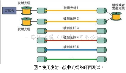 此种方式可以测试被测光缆的整条链路,以及所有的连接点。由于采用环回测量方法,技术人员仅需要一台OTDR用于双向OTDR测量。在纤的一端(近端)执行OTDR数据读取。一次可以同时测试两根光缆,所有数据读取时间被减为二分之一。测试人员需要2人,一人在近端OTDR位置,另一人位于光缆另一端,采用光纤跳线或者发射光缆将测试的两根光缆链路进行连接。