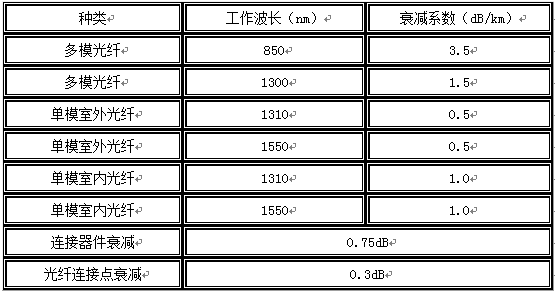 表1,光纤链路损耗参考值