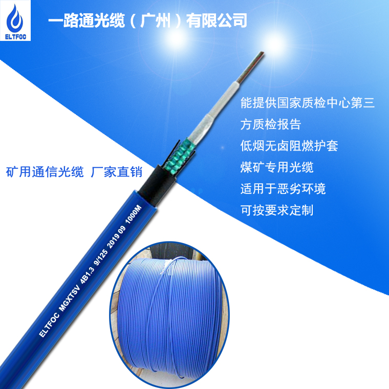 MGTSV标准矿用阻燃用光缆是将光纤套入高模量塑料制成的束管中,管内充满阻水化合物。中心加强钢丝,钢-聚乙烯粘结加强内护套,生产中束管和护套间填充高密度阻水无纺布或阻水油膏,再外包蓝色阻燃CMR.。